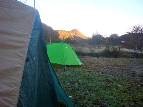 小雨が降り出し、急いでテント設営・・・夕飯準備!