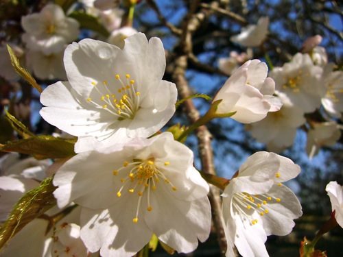 この白い桜は、葉が同時に出てました。
