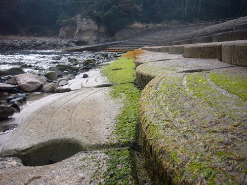 波際の階段には海苔が付いています。
