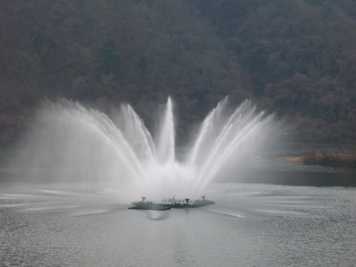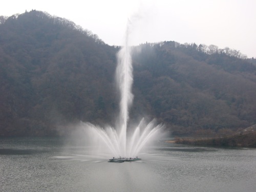 公園からダム湖を眺めていたら噴水が上がり始めました。